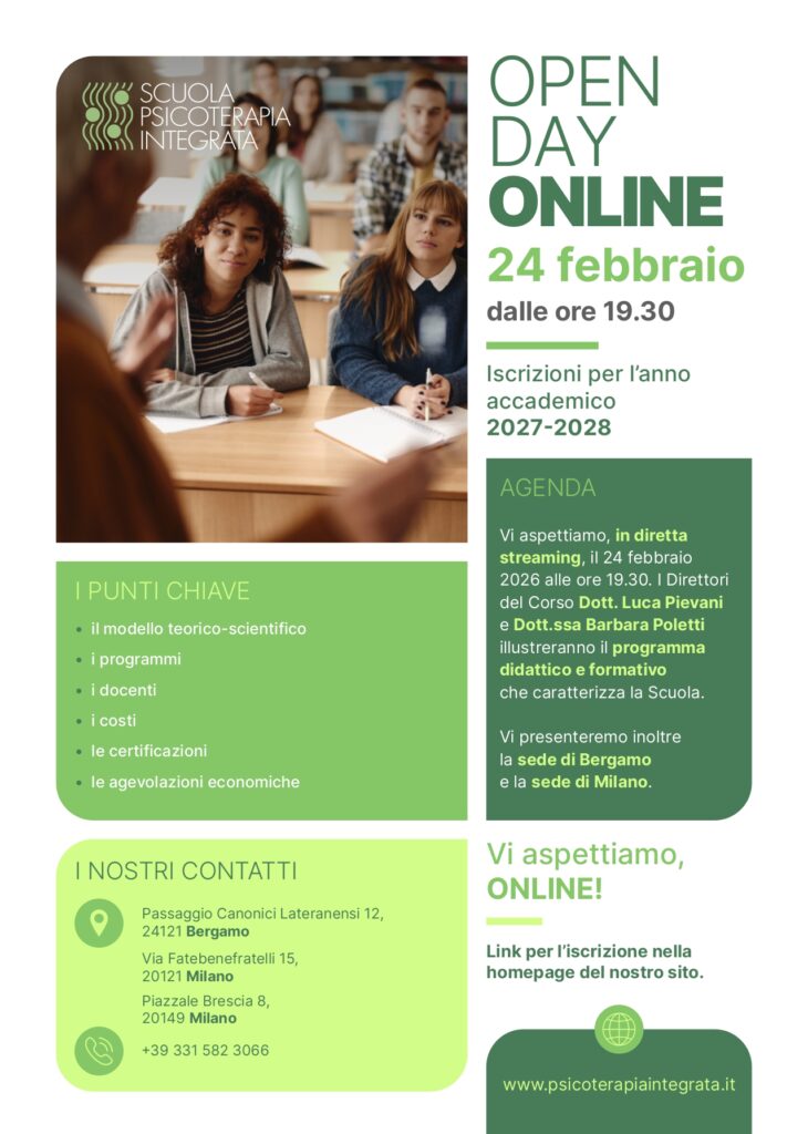 I Direttori del corso Dott.ssa Barbara Poletti e Dott. Luca Pievani illustreranno il programma didattico e formativo che caratterizza la Scuola. Vi presenteranno inoltre la sede di Bergamo e le sedi di Milano e illustreranno il modello teorico-scientifico, i programmi, i docenti, i costi, le agevolazioni economiche e le nuove certificazioni delle tecniche fornite dalla Scuola. Riceverete una mail con la conferma dell'iscrizione e il link per seguire l'evento. Per iscriversi all'evento compilare il form sottostante, tutti i campi sono…