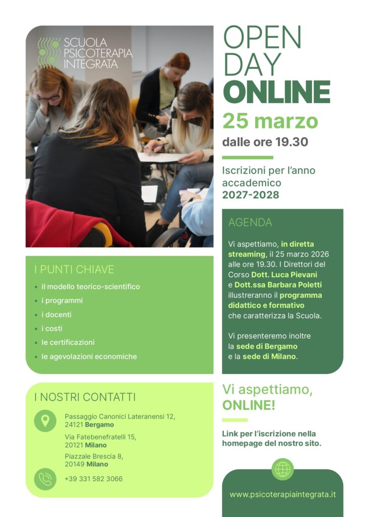 I Direttori del corso Dott.ssa Barbara Poletti e Dott. Luca Pievani illustreranno il programma didattico e formativo che caratterizza la Scuola. Vi presenteranno inoltre la sede di Bergamo e le sedi di Milano e illustreranno il modello teorico-scientifico, i programmi, i docenti, i costi, le agevolazioni economiche e le nuove certificazioni delle tecniche fornite dalla Scuola. Riceverete una mail con la conferma dell'iscrizione e il link per seguire l'evento. Per iscriversi all'evento compilare il form sottostante, tutti i campi sono…
