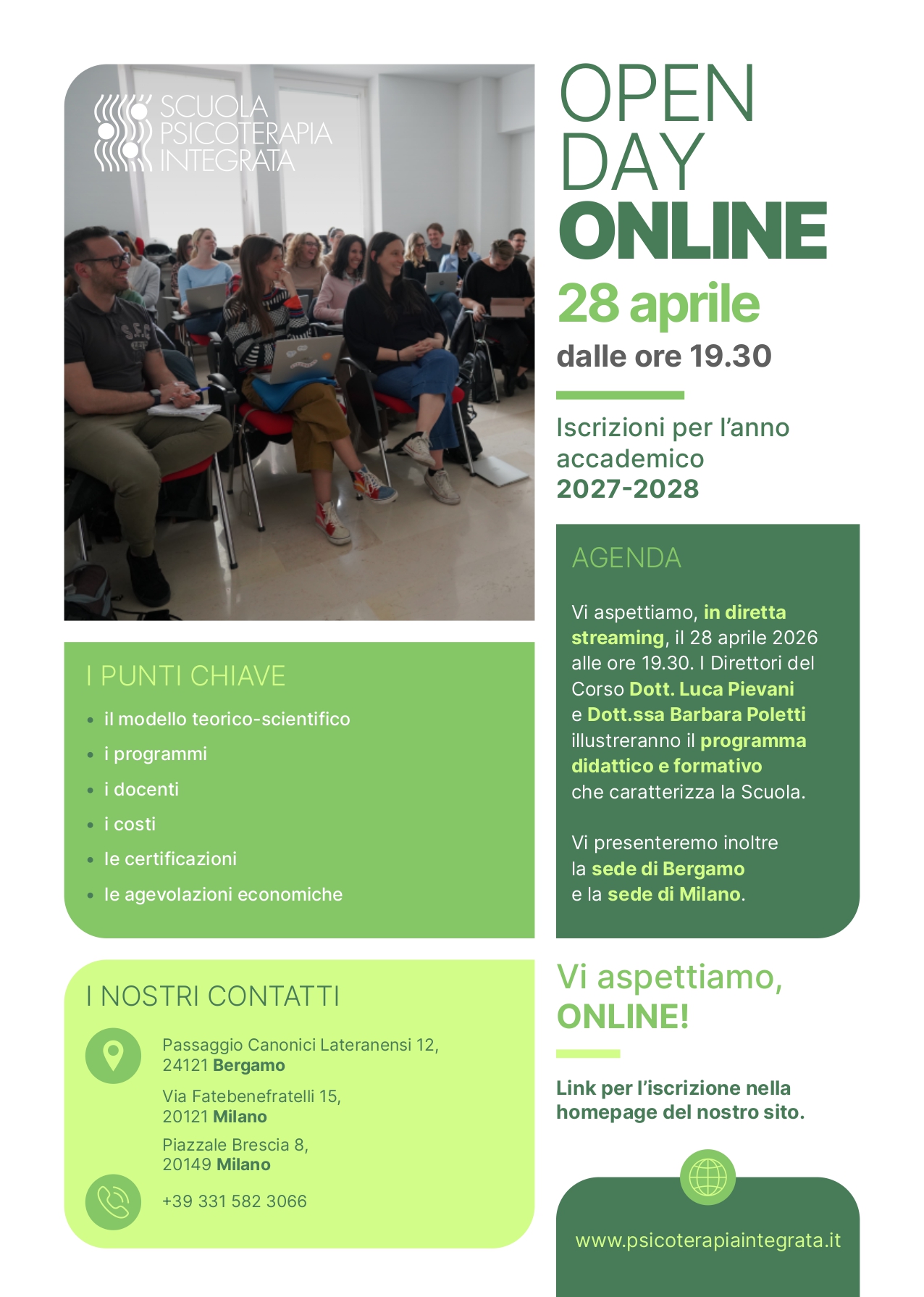 Vi presenteranno inoltre la sede di Bergamo e le sedi di Milano e illustreranno il modello teorico-scientifico, i programmi, i docenti, i costi, le agevolazioni economiche e le nuove certificazioni delle tecniche fornite dalla Scuola.